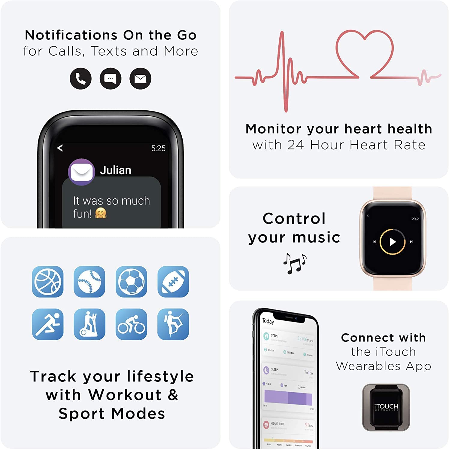 • MOBILE PHONE COMPATIBLE: Beyond tracking, this smartwatch connects to the iTouch app, available for iPhones and Androids, so you can receive incoming phone messages, calls, and more. The iTouch Air 3 also offers Bluetooth and GPS connectivity.