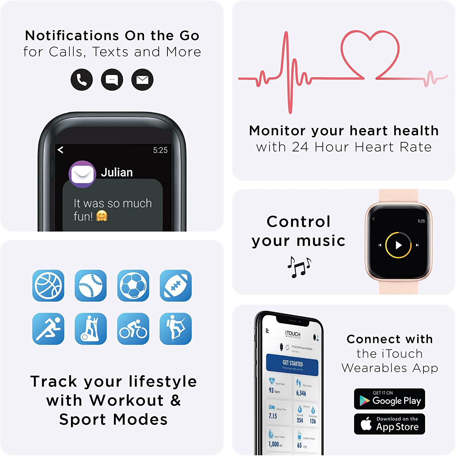 • HEALTH AND FITNESS TRACKER: Use the iTouch Air 3 wearable fitness tracker to monitor your activity and to stay motivated while you reach your workout goals. With this smartwatch, stay on top of your health while staying in touch with others. Features a hydration reminder, breathing exervises, hygiene assistant, and an elevated heartrate reminder.